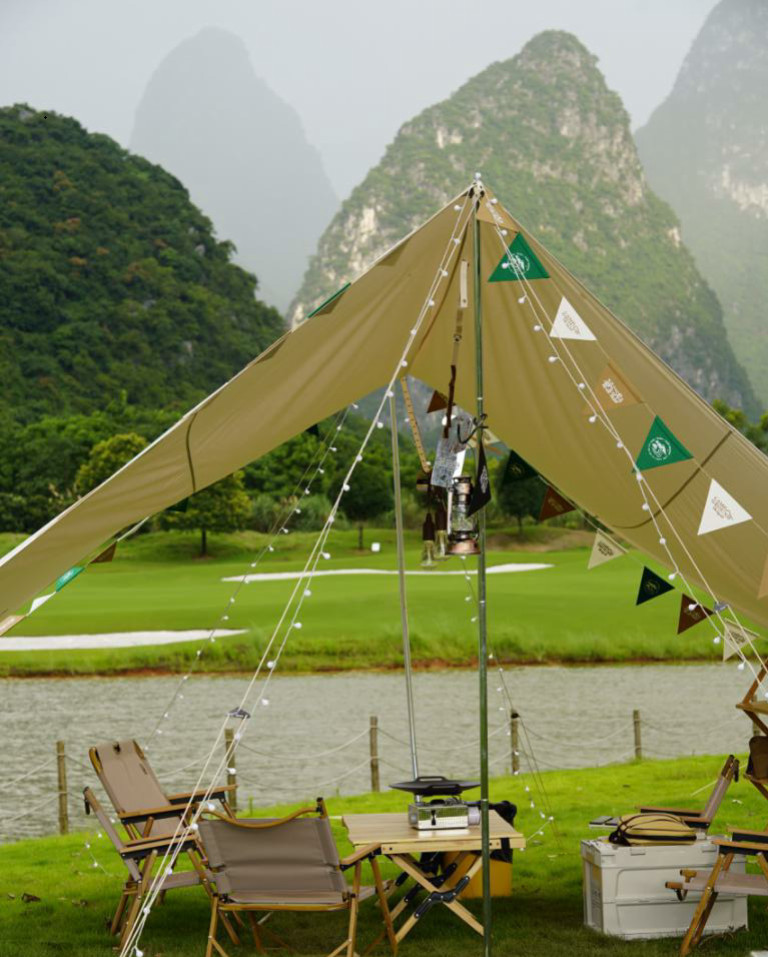 自然美宿:營(yíng)地設(shè)備均為一線品牌戶外裝備,美陳設(shè)計(jì)結(jié)合露營(yíng)原始美學(xué)與桂林山水,形成獨(dú)樹(shù)一幟的視覺(jué)風(fēng)格。營(yíng)地有完備的衛(wèi)生基礎(chǔ)設(shè)施及服務(wù)中心,讓你的身心方便在戶外拋開(kāi)窘迫,享受自然。