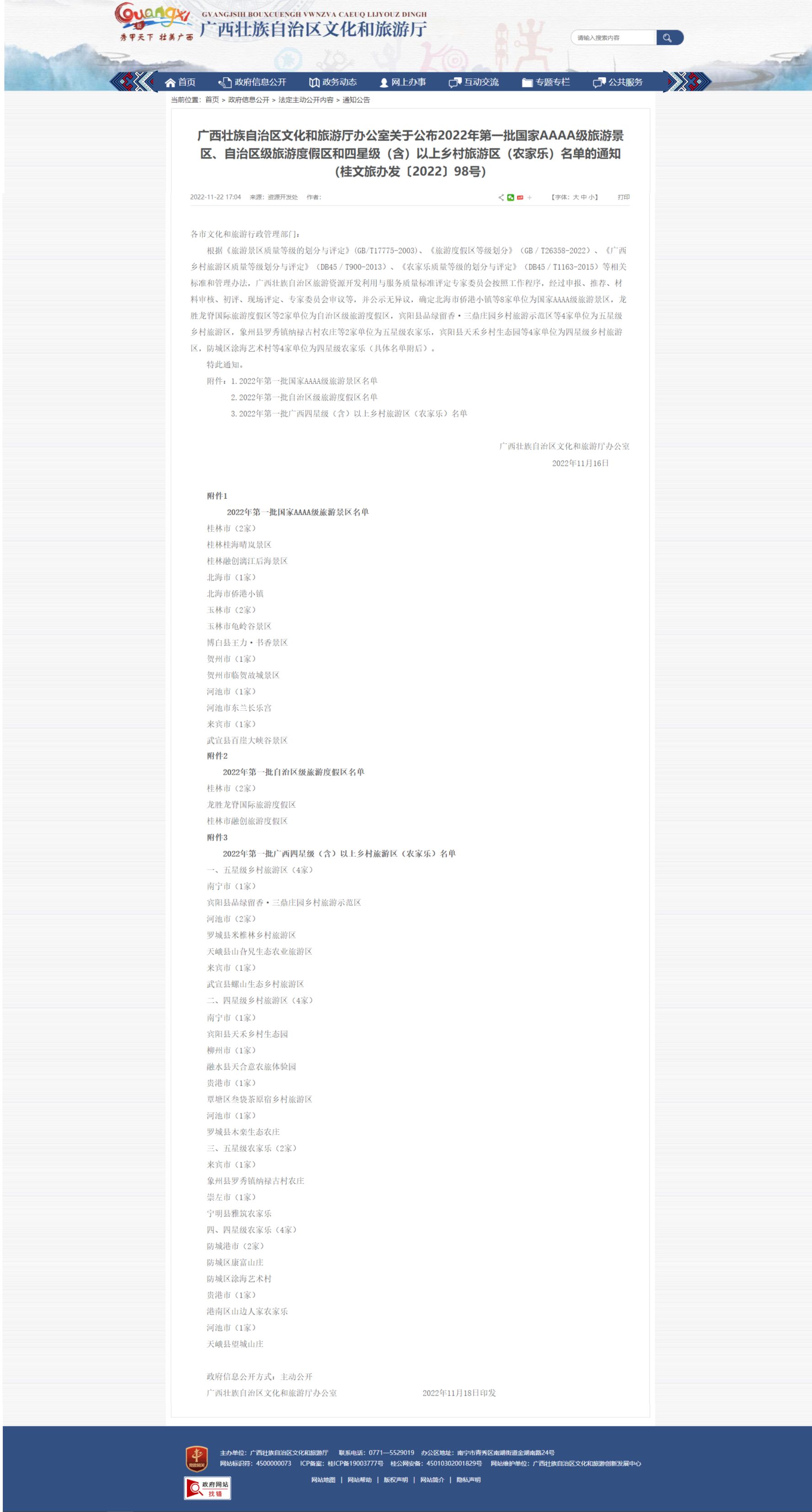 廣西壯族自治區(qū)文化和旅游廳辦公室關(guān)于公布2022年第一批國家AAAA級(jí)旅游景區(qū)、自治區(qū)級(jí)旅游度假區(qū)和四星級(jí)(含)以上鄉(xiāng)村旅游區(qū)(農(nóng)家樂)名單的通知 (桂文旅辦發(fā)〔2022〕98號(hào))