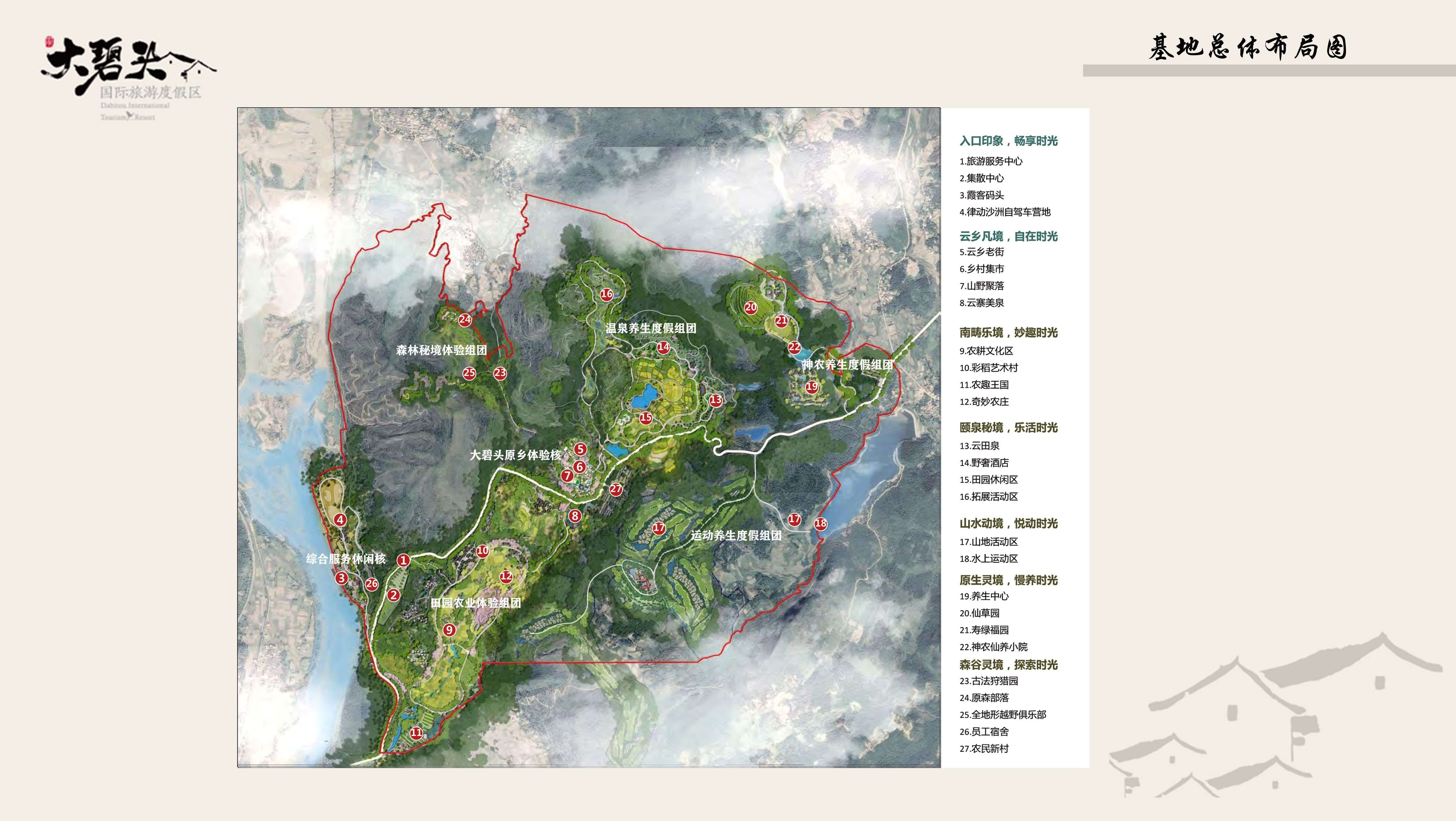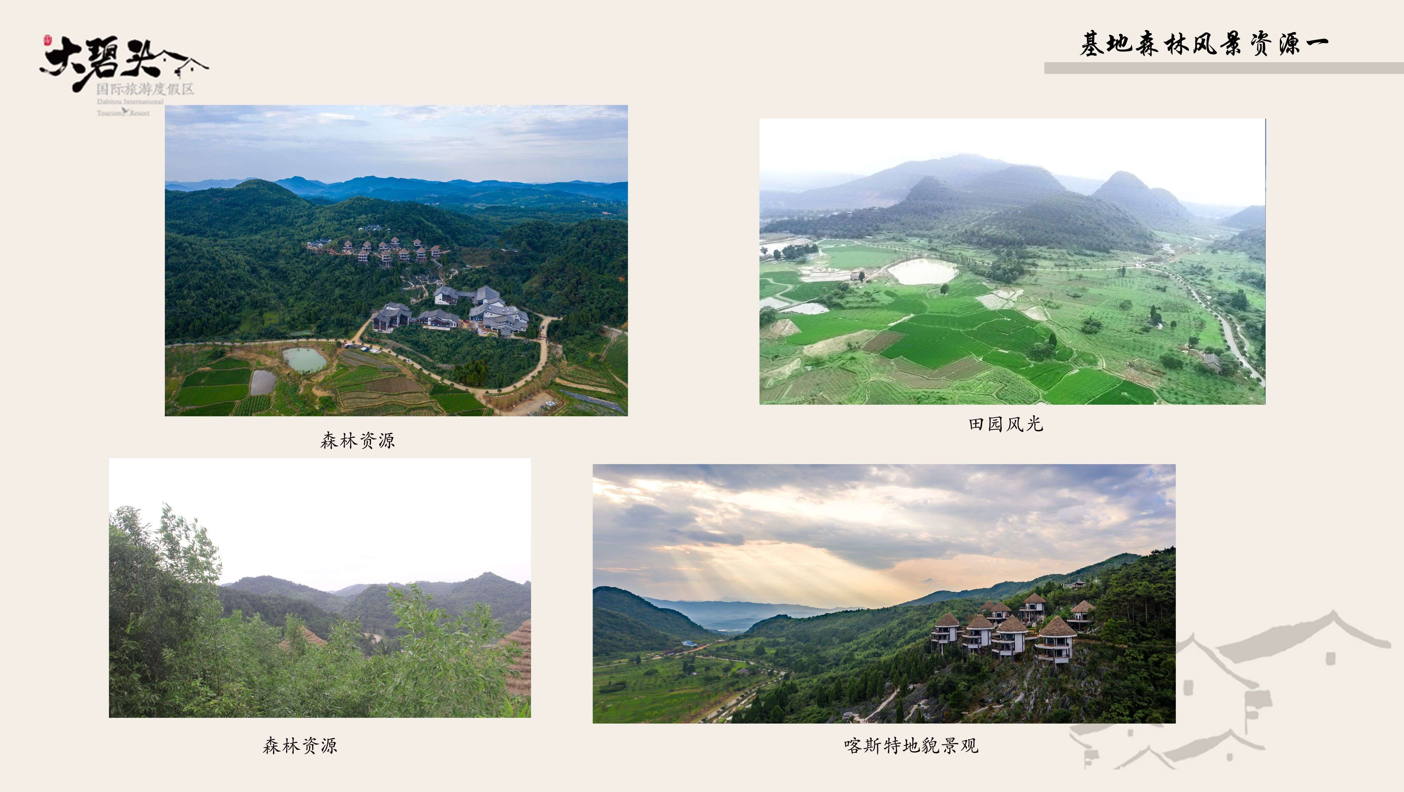 基地地貌屬喀斯特地貌,群山環(huán)繞,河道在峽谷間延伸,山間洼地、谷地交錯分布。結(jié)合基地內(nèi)田園風光、小盆地、古村落等,阡陌交錯,構(gòu)成了一幅林木青翠、田園牧歌、山水風光、炊煙渺渺的景觀畫面。