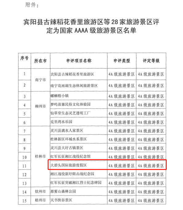 近日,根據(jù)廣西壯族自治區(qū)文化和旅游廳官網(wǎng)《公告》,桂林全州大碧頭國際旅游度假區(qū)等28家旅游景區(qū)達(dá)到4A級(jí)景區(qū)質(zhì)量等級(jí)標(biāo)準(zhǔn),批準(zhǔn)為4A級(jí)旅游景區(qū)。這意味著,桂林旅游發(fā)展產(chǎn)業(yè)蓄勢勃發(fā),邁向新的征程,為區(qū)內(nèi)外游客們提供更為豐富、更為精彩的旅游體驗(yàn)。